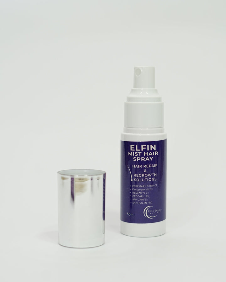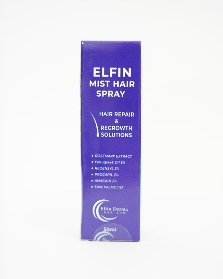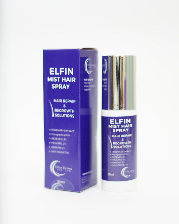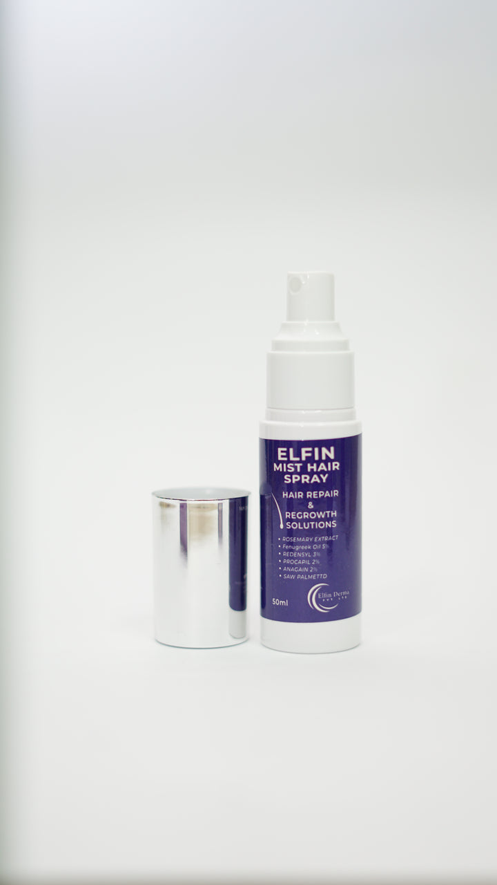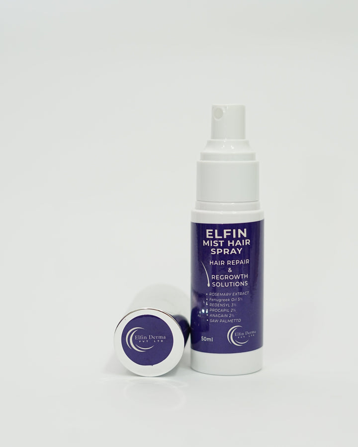 Elfin Mist Hair Spray is a targeted solution for hair loss, alopecia, and hair regrowth. Formulated with 5% Fenugreek Oil and Rosemary Extract, it nourishes the scalp and strengthens hair roots. The powerful trio of Redensyl (3%), Procapil (2%), and Anagain (2%) work synergistically to stimulate hair follicles, reduce hair fall, and promote thicker, healthier hair. Saw Palmetto supports scalp health and prevents further hair thinning. Lightweight and easy to use, this 50ml mist revitalizes hair and aids in lasting hair repair and growth, making it an essential part of your hair care routine.