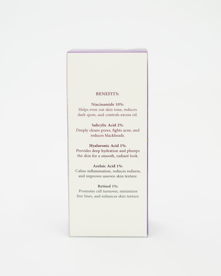 Niacinamide 10%, Salicylic Acid 2%, Hyaluronic Acid 1%, Azelaic Acid 1%, Retinol 1%
