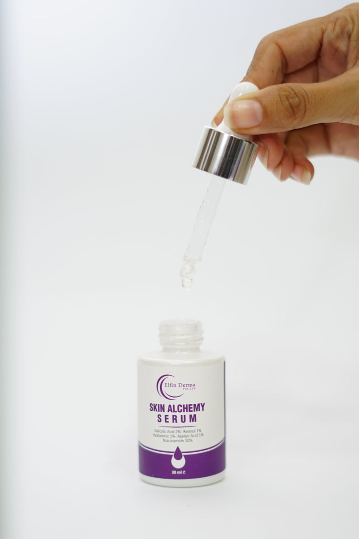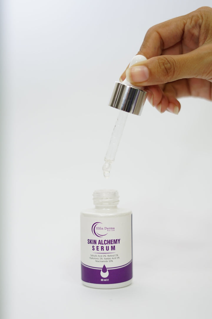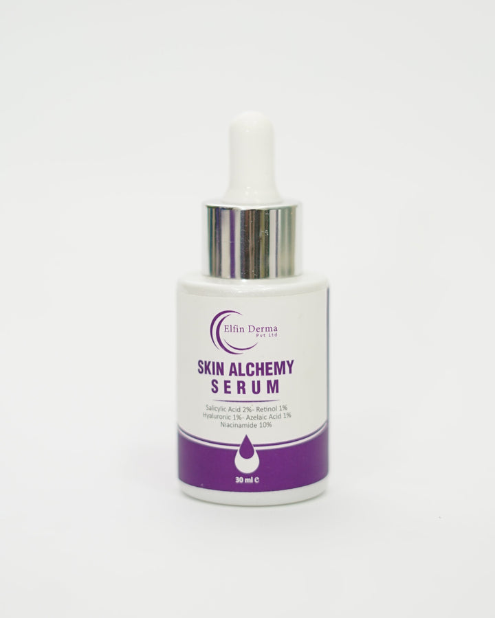 Skin Alchemy Serum is a powerful multi-action formula designed to improve skin texture, even out skin tone, and deeply hydrate the skin. Enriched with 10% Niacinamide to reduce dark spots and control excess oil, 2% Salicylic Acid to unclog pores and fight acne, and 1% Hyaluronic Acid for deep hydration and plumping. The serum also contains 1% Azelaic Acid to calm inflammation and reduce redness and 1% Retinol to promote cell turnover and minimize fine lines. This 30ml serum is your daily essential for clearer, smoother, and radiant skin.